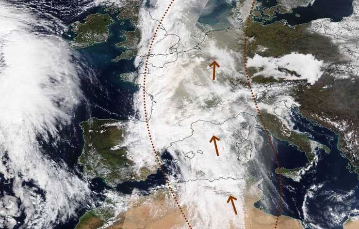 Exit la vague de froid sur la partie ouest de l'Europe ! C'est désormais un puissant flux de sud qui domine. Depuis la journée du dimanche 21 février 2021, il entraîne la remontée de sable venu du Sahara dans le ciel Français, particulièrement identifiable sur l'image satellite ci-dessus entre le Massif Central et les Pays-Bas.