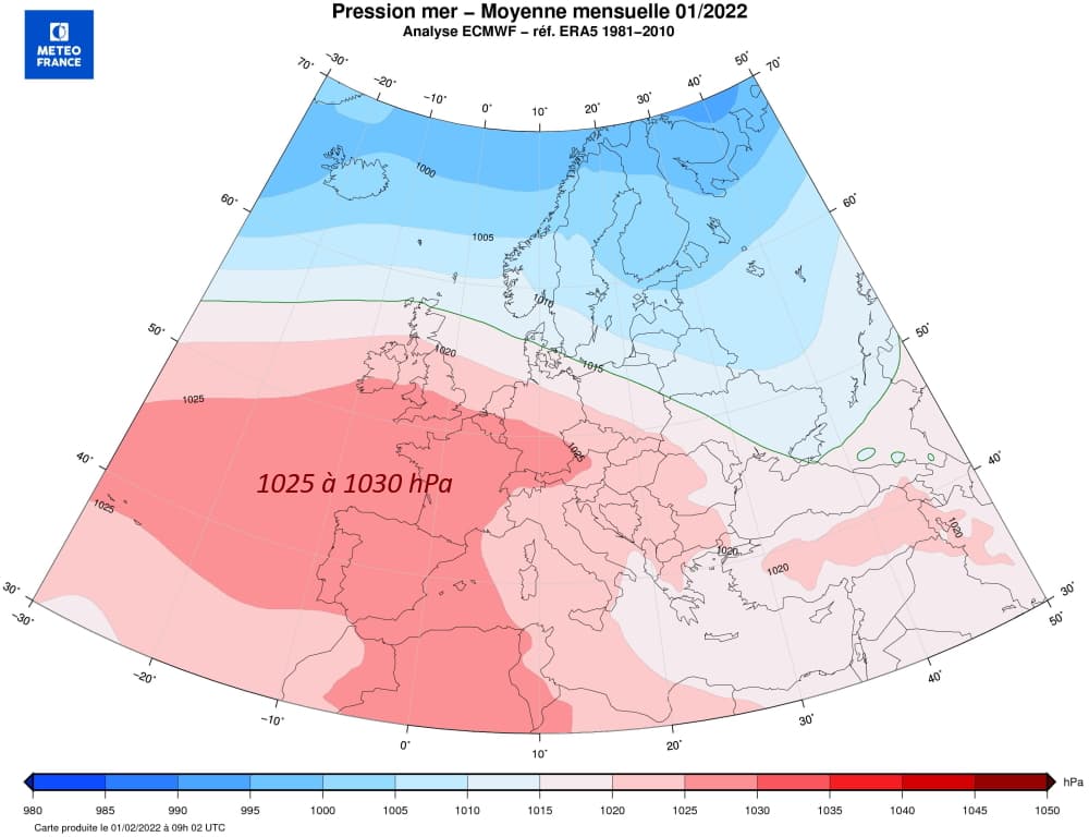 Pressions moyennes sur le continent européen en janvier 2022 - via Météo France / Gaëtan Heymes