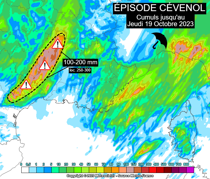 L'épisode pluvieux attendu ce mercredi 18 octobre 2023 et jusqu'en matinée du jeudi 19 octobre présentera des caractéristiques typiquement cévenoles. Les cumuls les plus conséquents concerneront les contreforts des Cévennes avec en moyenne 100 à 200 mm. Des pointes de 250 à 300 mm ne sont pas exclues. Notons que si la frange littorale du Gard et de l'Hérault devrait rester en marge des précipitations les plus actives, les plaines de l'Ardèche pourraient en revanche être concernées au même titre que les Cévennes. Ce secteur sera donc à surveiller de près.