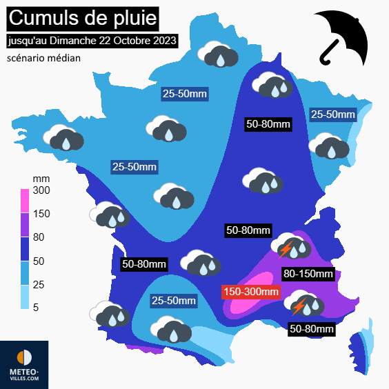 Cumuls de pluie envisagés jusqu'au dimanche 22 octobre 2023 - Météo Villes
