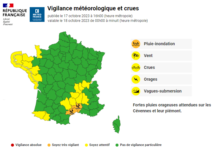 Carte de vigilance valable pour ce mercredi 18 octobre 2023 - via Météo France