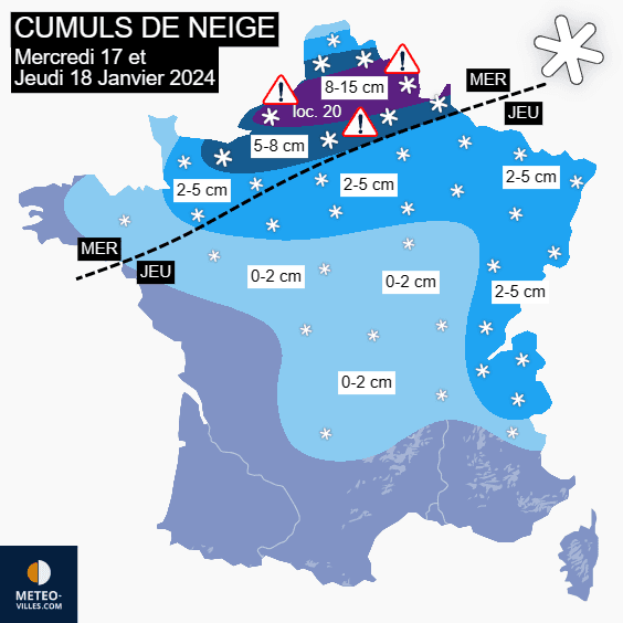 Cumuls de neige prévus ces mercredi 17 et jeudi 18 janvier 2024 - Météo Villes