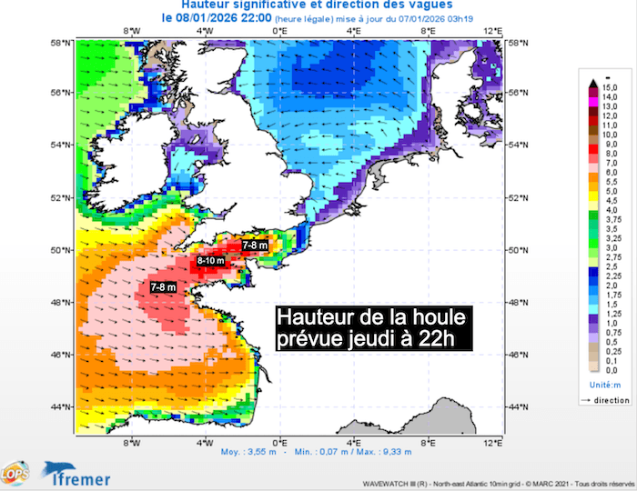 Hauteur de la houle prévue jeudi à 22h sur les côtes françaises sur les côtes atlantiques et de la Manche - Ifremer