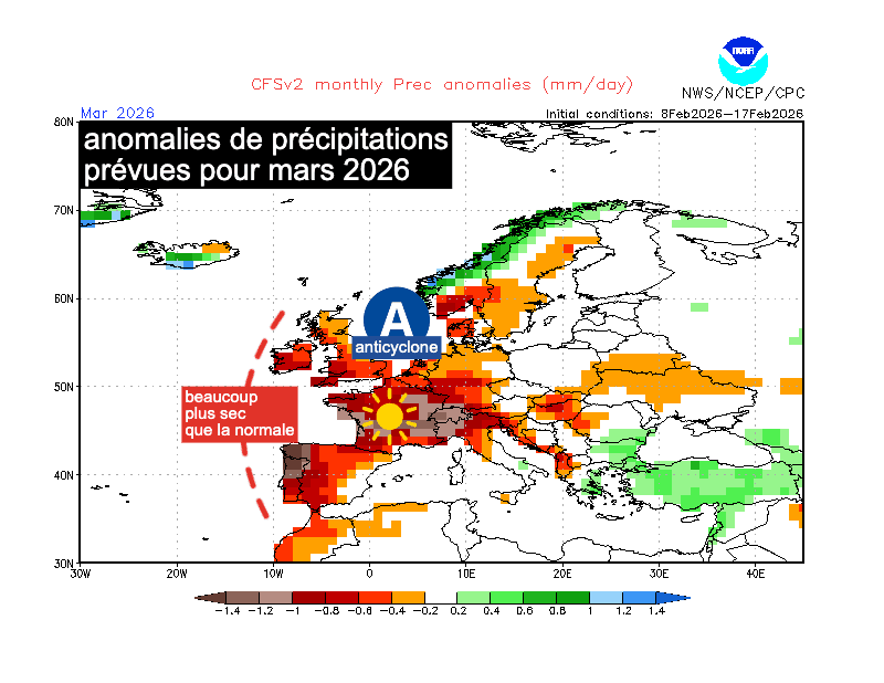 Anomalie des précipitations en Europe prévue pour mars 2026 - NCEP et meteo-villes.com