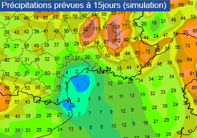 Précipitations prévues à 15 jours - simulation GFS via Meteociel