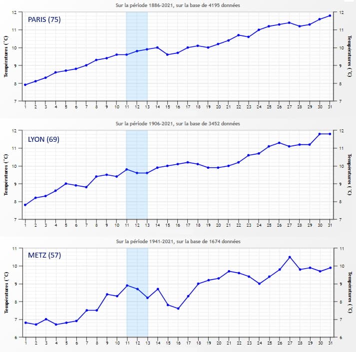 Températures minimales moyennes en mai depuis le début des relevés à Paris, Lyon et Metz - via infoclimat.fr