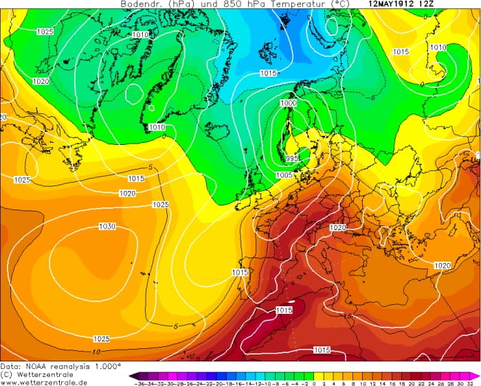 Masse d'air à 850 hPa le 12 mai 1912 - via Wetterzentrale
