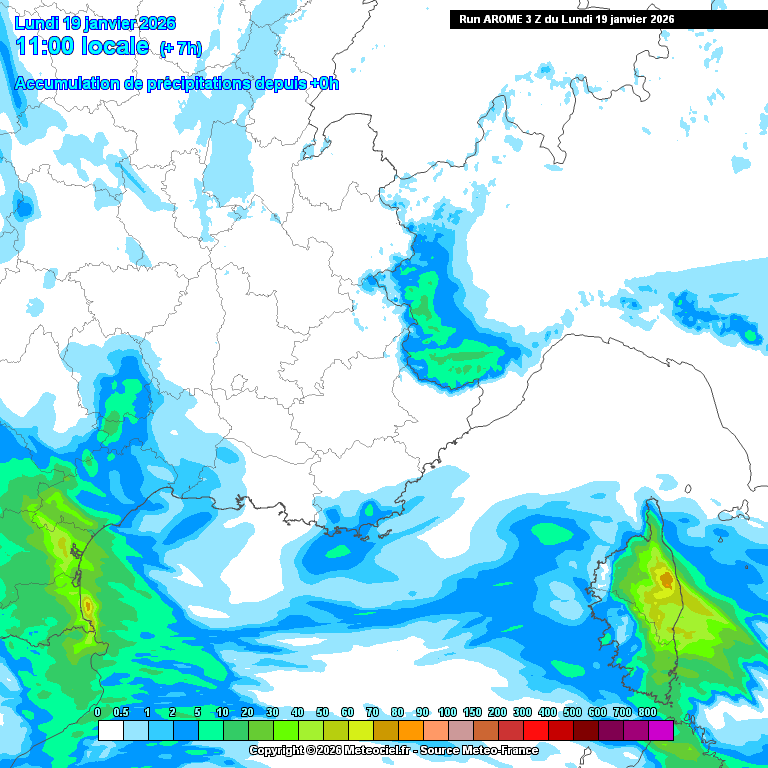 Animation des cumuls de précipitations d'ici mardi 20 janvier au soir sur le sud-est de la France – arome via meteociel.fr
