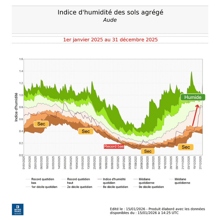 Évolution de l'indice d'humidité des sols sur l'Aude entre le 1er janvier et le 31 décembre 2025 – Météo-France
