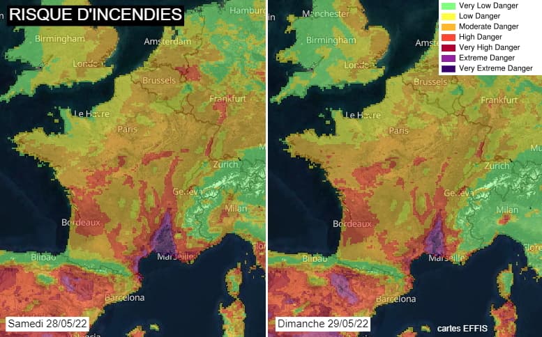 Modélisation du risque d'incendies pour les samedi 28 et dimanche 29 mai 2022 - via EFFIS