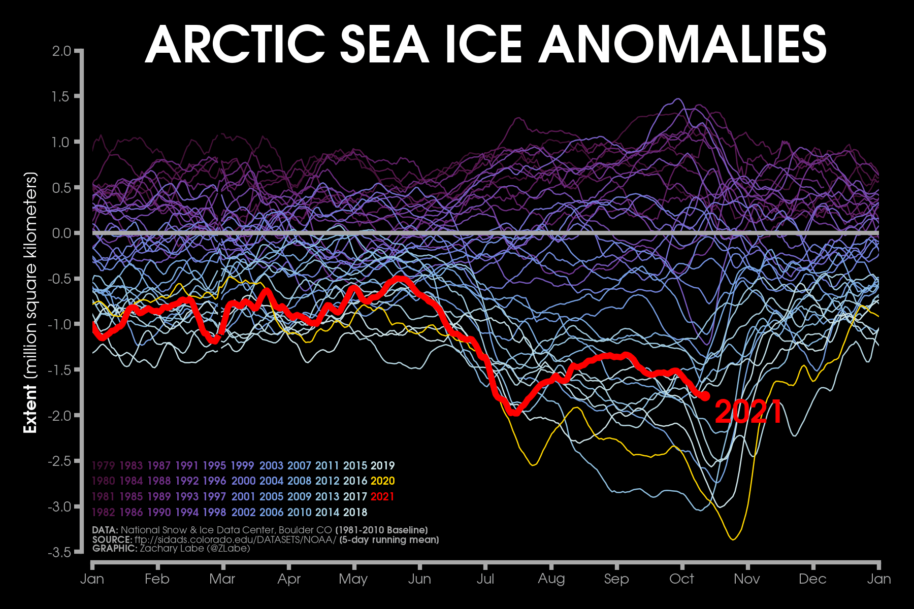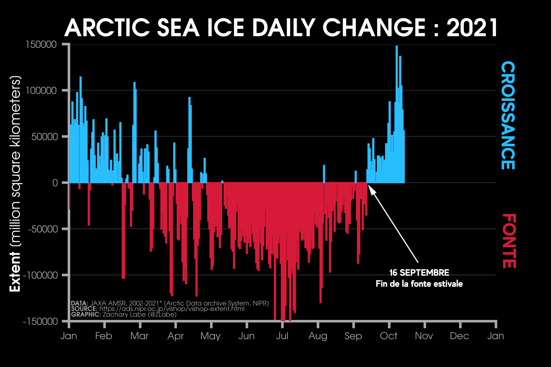 Cette fin de fonte de la banquise intervient généralement au mois de septembre. En cette année 2021, la bascule s'est effectuée lors de la journée du 16 septembre, date à laquelle l'étendue minimale a été atteinte. Désormais, les glaces se reconstituent, avec une croissance dépassant parfois les 100.000km2 par jour.