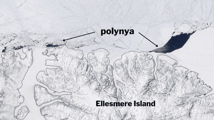 Preuve s'il en est de l'état inquiétant de cette banquise : des scientifiques ont constaté la présence d'une polynie (étendue d'eau libre entourée par la banquise) en mai 2020 durant deux semaines, au nord de l'île d'Ellesmere (extrême Nord du territoire Canadien du Nunavut, près du Groenland).