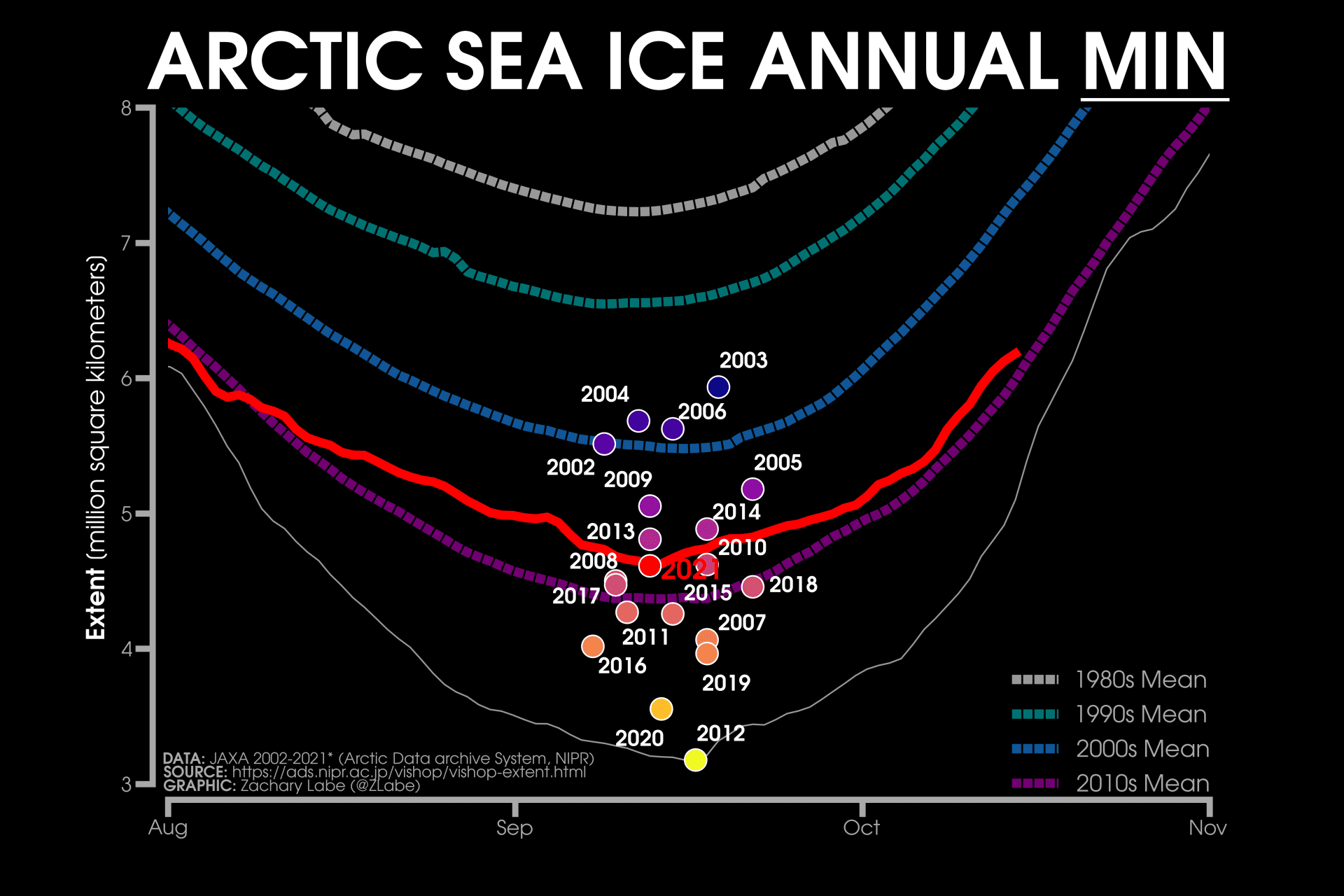 Ce 16 septembre 2021, cette banquise Arctique était étendue sur 4,724 millions de km2. Ce minimum annuel est un répit par rapport aux années précédentes, marquées par des records en série : il s'agit de la 12e étendue la plus basse depuis le début des analyses satellites (en 1979), mais il s'agit surtout de la valeur la plus élevée depuis l'année 2014.