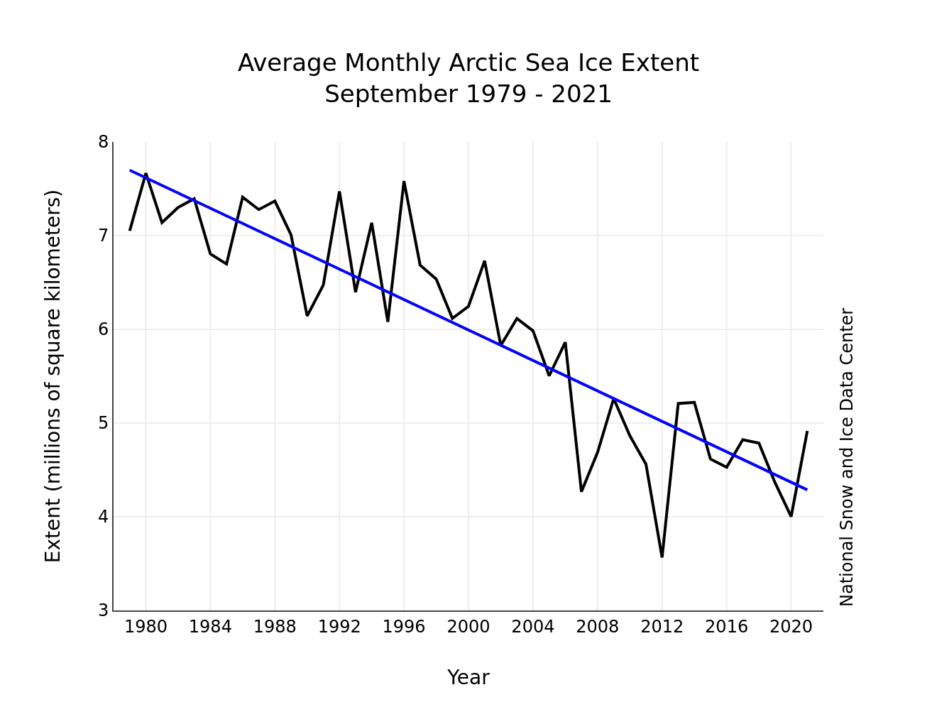 Sur plus de 40 ans de mesures (période 1979-2021), l'évolution démontre une fonte globale sensible, évaluée à environ 81 200km2 chaque année en septembre, soit 12.7% de perte de glace tous les 10 ans. A ce rythme, l'Arctique pourrait être en majeure partie libérée des glaces l'été (< 2 millions de km2) d'ici l'horizon 2050.