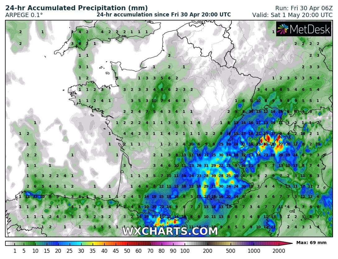 Cumuls de précipitation en 24h jusqu’à dimanche 2 mai minuit sur la France – Modèle arpège via WX CHARTS