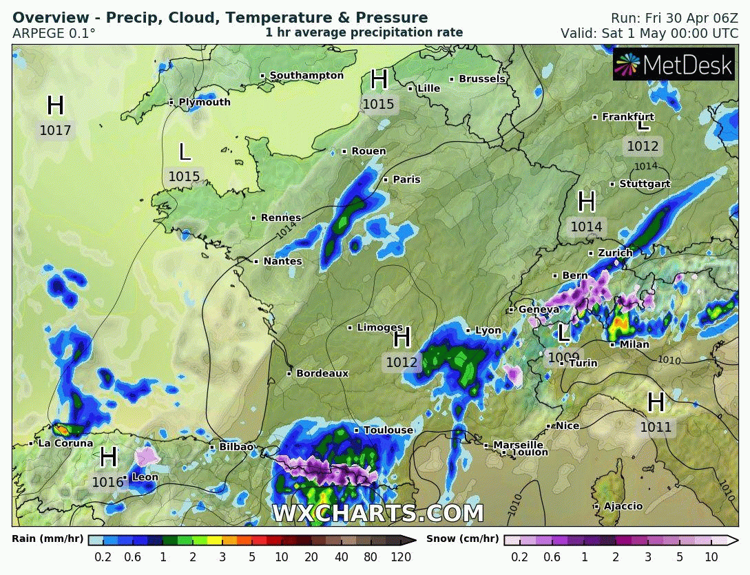 Animation du risque de précipitations pour ce samedi 1er mai 2021 sur la France – Modèle Arpège via WX CHARTS