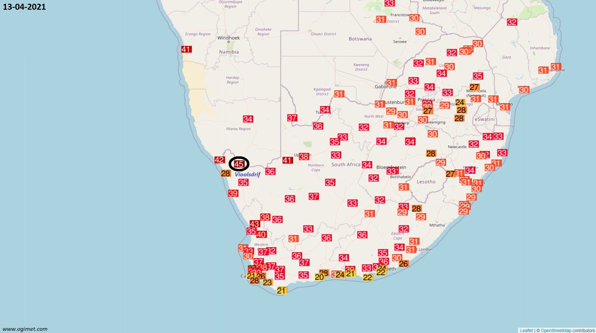 Températures maximales relevées le 13 avril 2021 en Afrique-du-Sud – Via twitter - @EKmeteo