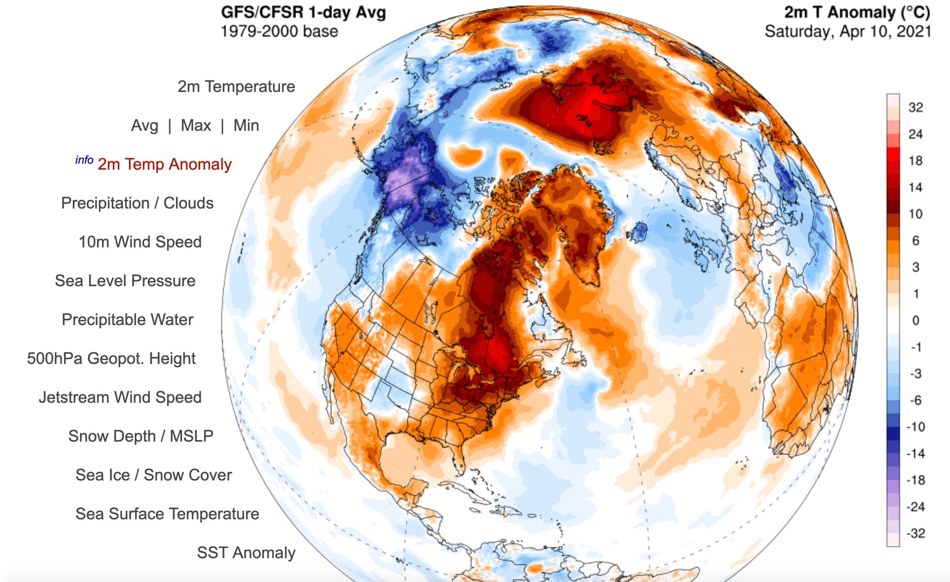 Anomalies de températures du vendredi 16 avril et phénomènes marquants de ces derniers jours dans le monde - ClimateReanalyzer - modifié par Météo-Villes
