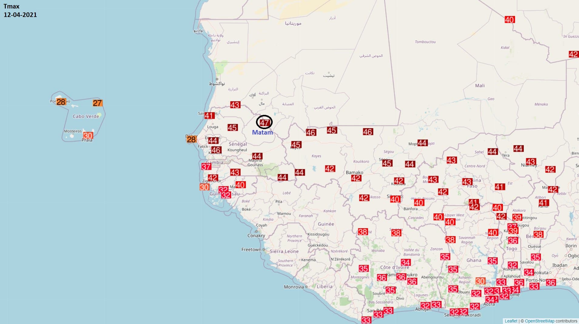 Températures maximales relevées le 12 avril 2021 au Sénégal – Via twitter - @EKmeteo