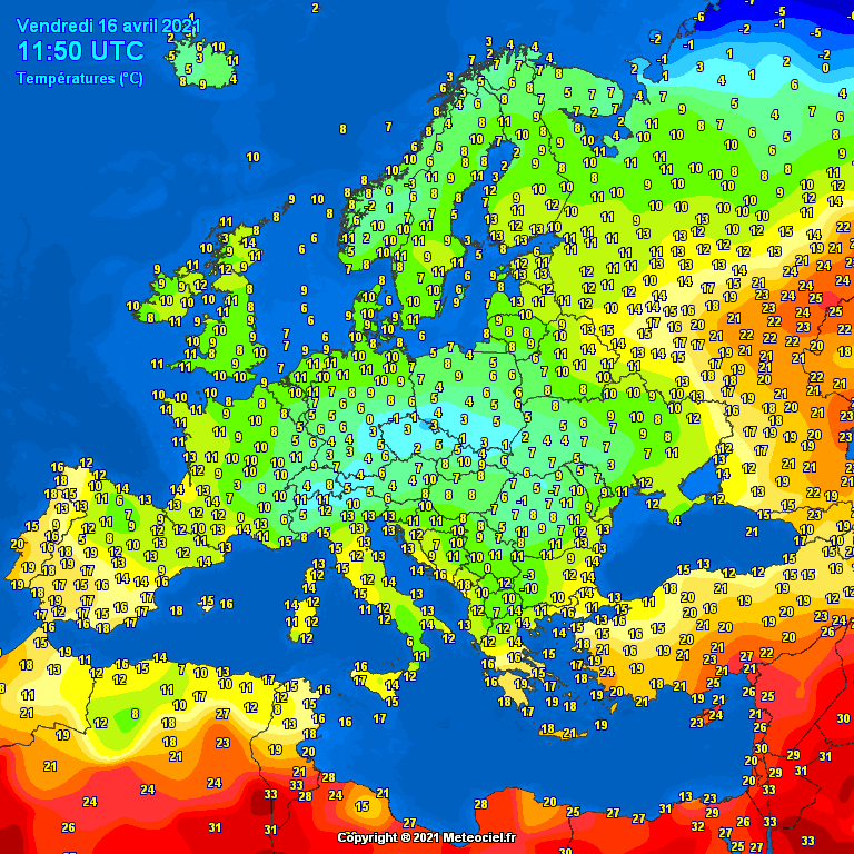 Températures relevées ce vendredi 16 avril sur l’Europe – Météociel.fr