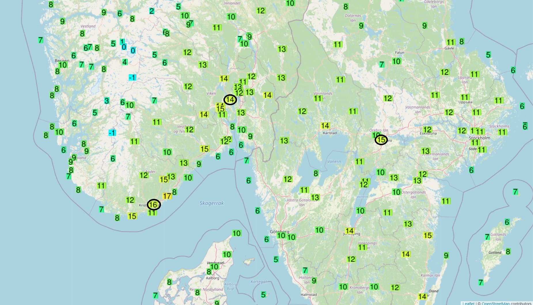 Températures maximales relevées le 28 février sur le Sud de la Scandinavie et records mensuels associés (entourés en noir) – Via Ogimet et twitter : @EKmeteo