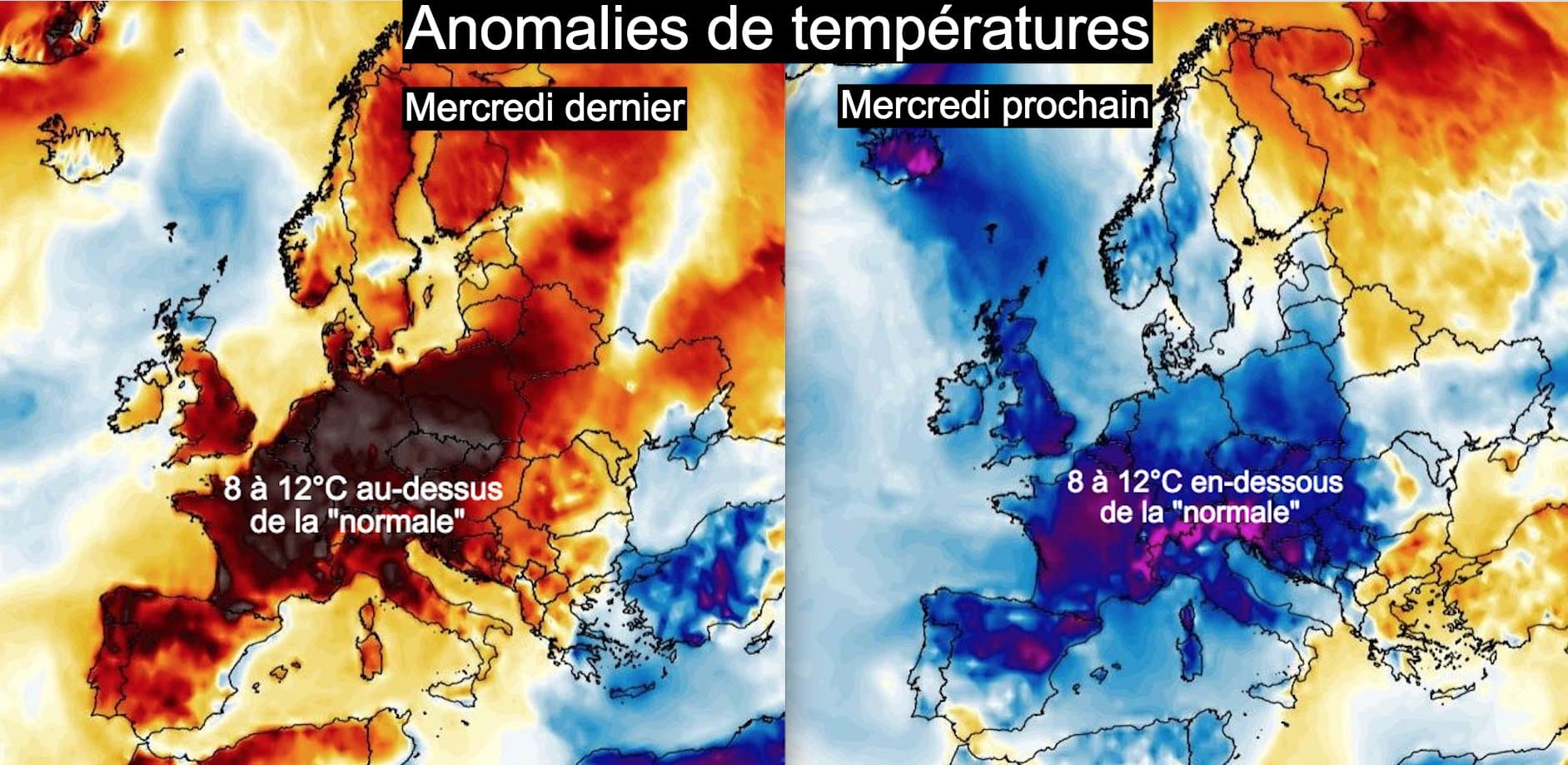 Alors que nous battions des records en série mercredi dernier avec des niveaux plus de 12°C au dessus de la moyenne, nous devrions être à l'inverse 8 à 12°C sous les valeurs de saison ce mercredi... Par endroit, la chute pourrait atteindre plus de 20°C en l'espace d'une semaine.