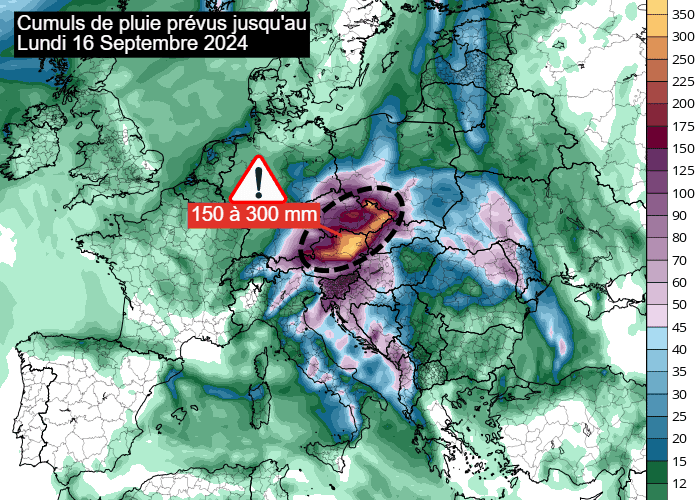 Avec une goutte froide amenée à faire du sur-place pendant plusieurs jours et une masse d'air gorgée d'humidité remontant de Méditerranée, tous les paramètres seront réunis pour un épisode pluvieux durable et d'ampleur remarquable. D'ici au lundi 16 septembre 2024, les cumuls atteindront souvent entre 150 et 300 mm sur le sud-ouest de la Pologne, une bonne partie de la République Tchèque et la moitié nord de l'Autriche ! Certains scénarios envisagent jusque 350 voire 400 mm avec un maximum sur le nord-est de l'Autriche. Avec de telles quantités d'eau, des inondations dramatiques semblent inévitables.