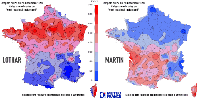 Rafales maximales causées par les tempêtes Lothar et Martin fin décembre 1999 - Météo France