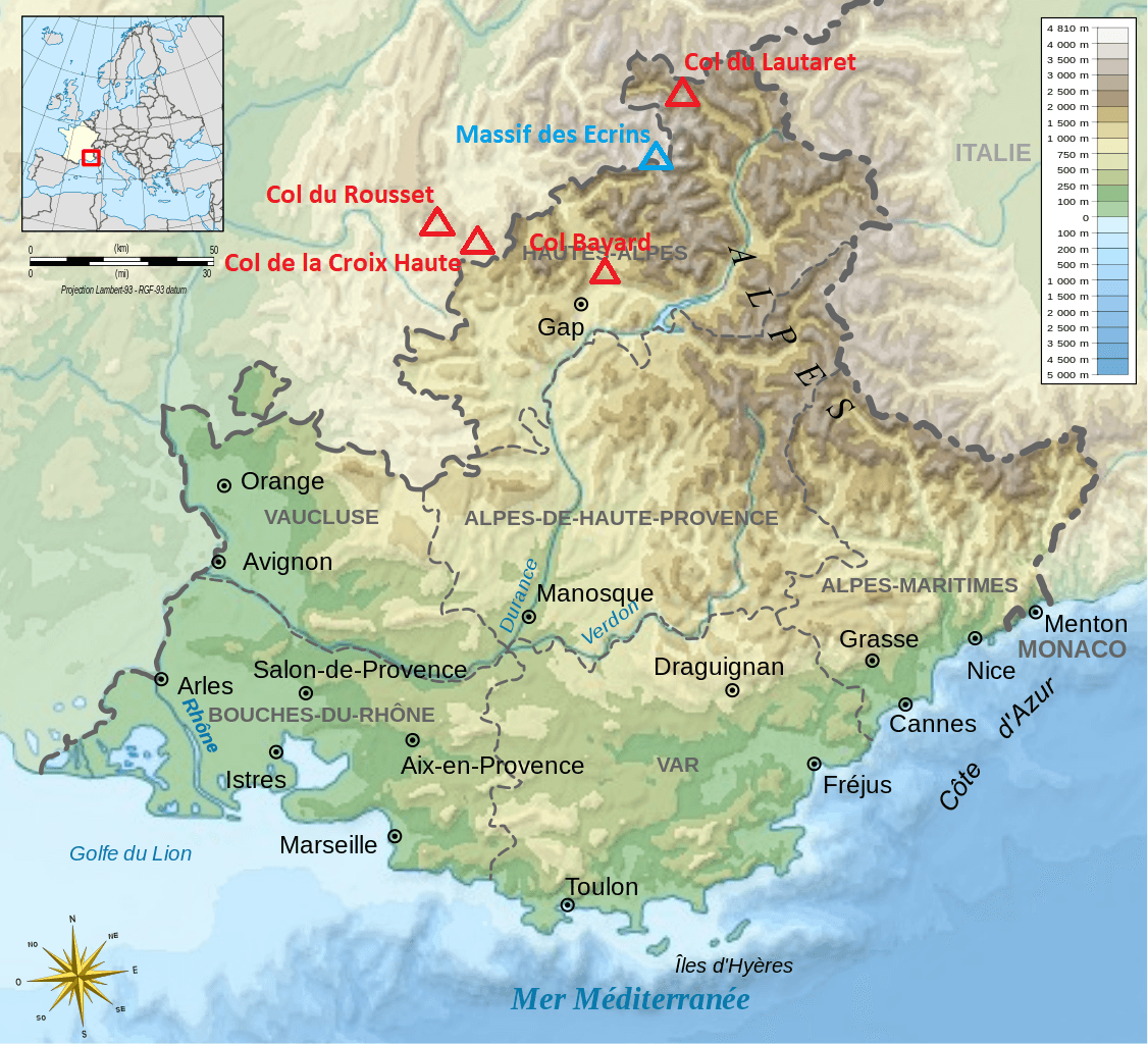 Lieux de démarcation climatiques remarquables, les cols sont en rouge, le massif est en bleu - fond de carte Wikipedia COMMONS