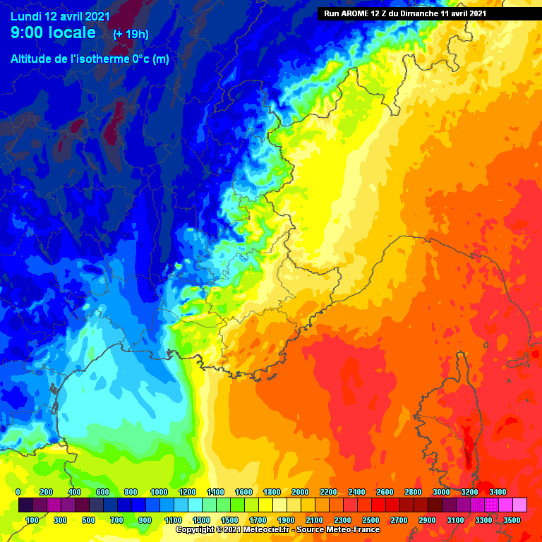 Altitude de l'isotherme 0°C au matin du 12 avril 2021 - Modèle AROME, Meteociel