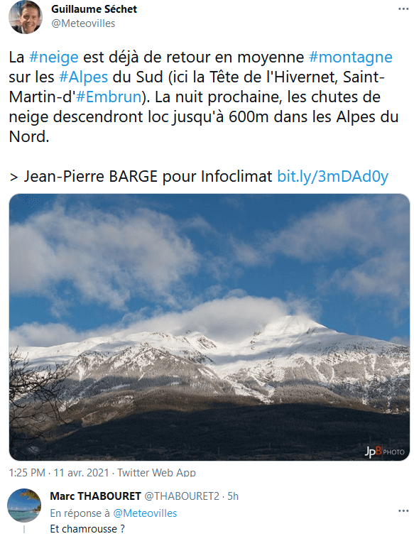 Activité sur le tweet concernant la neige de ce 11 avril à 13h30