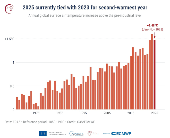 Sur la période allant de janvier à novembre 2025, l'anomalie thermique sur Terre atteint +1,48°C par rapport à l'ère pré-industrielle (1850-1900) ! Ce chiffre est très proche de l'objectif des accords de Paris sur le climat, adopté fin 2015, qui visaient à limiter le réchauffement à +1,5°C. Cette anomalie est semblable à celle enregistrée durant l'année 2023 mais reste derrière celle de 2024, qui était devenue la première année à dépasser la barre symbolique des +1,5°C avec une anomalie mondiale sur 12 mois de +1,55°C.