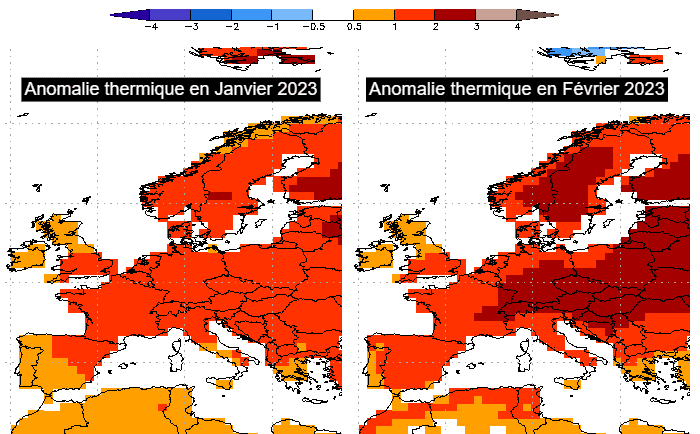 Anomalie thermique selon le modèle européen pour janvier et février 2023 - via EFFIS/Copernicus