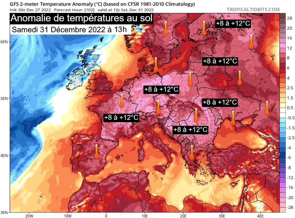 Anomalie thermique les samedi 31 décembre 2022 et dimanche 1er janvier 2023 - via tropicaltidbits.com