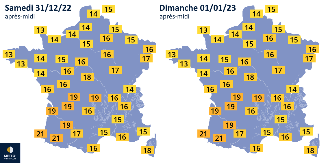 Températures maximales prévues les samedi 31 décembre 2022 et dimanche 1er janvier 2023 - Météo Villes