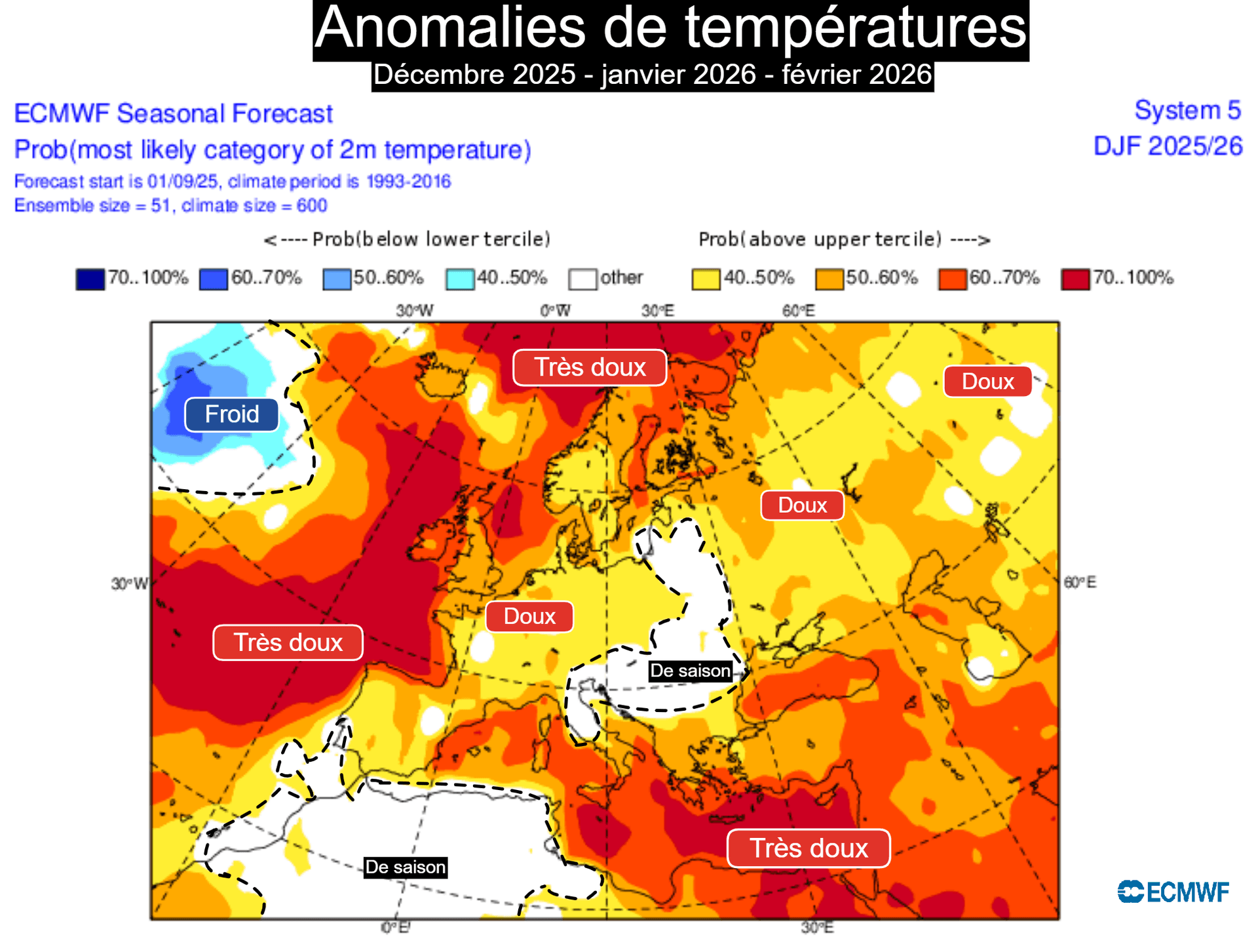 Bien sûr, si un mois est prévu plus doux que la normale, cela ne veut pas forcément dire que la totalité de ce mois sera anormalement douce, simplement que les températures moyennes de la période seront situées au-dessus des normales. Autrement dit, cela n'empêchera pas des périodes plus froides de se produire bien que, là encore, le risque de véritable vague de froid est de plus en plus faible au fil des années.