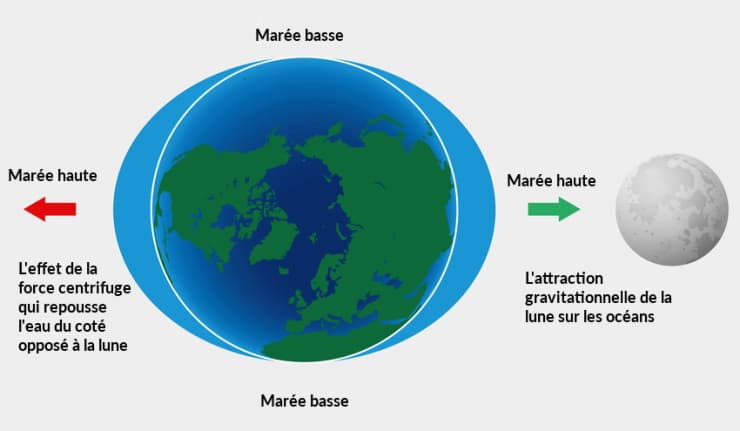La gravitation crée une attraction réciproque entre les corps célestes. Sur Terre, la Lune et le Soleil exercent donc une force d'attraction significative. Celle du Soleil est beaucoup plus importante (de par sa masse) mais comme la Lune est considérablement plus proche de nous, c'est son attraction qui est la plus forte (environ 2,2 fois celle du Soleil). C'est donc la position de la Lune qui détermine en grande partie les marées, en attirant les eaux.