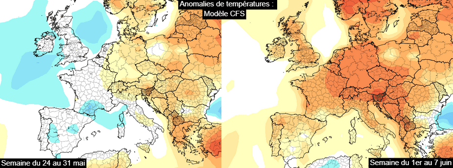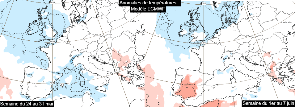 Anomalies de températures pour les semaines du 24 au 31 mai et du 1 au 7 juin 2021 – Modèle ECMWF