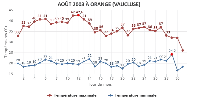 Températures minimales et maximales en août 2003 à Orange (84) - via infoclimat.fr