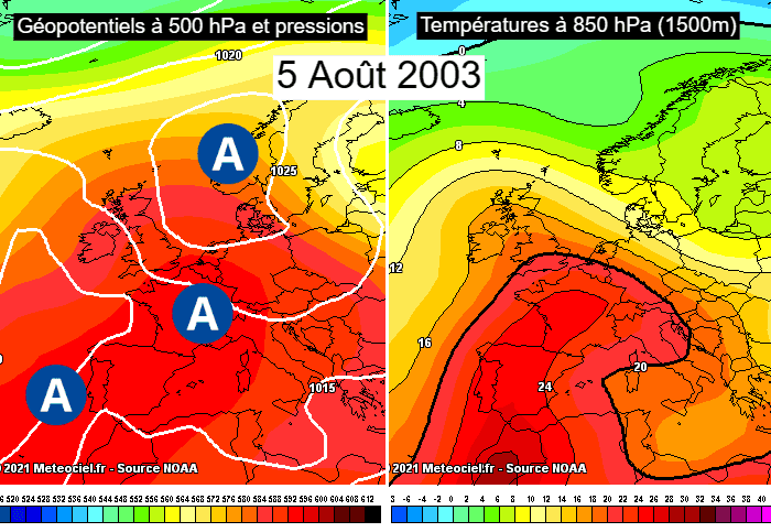 Il y a exactement 20 ans, la canicule d'août 2003 venait de s'achever après avoir marqué les esprits des Français. Durant la première quinzaine du mois d'août 2003, un puissant dôme de chaleur s'était mis en place au dessus de l'Europe de l'Ouest, englobant l'ensemble de la France. Comme on le voit sur les cartes de réanalyse ci-dessous, cette canicule était soutenue par des hautes pressions grimpant jusqu'en Scandinavie et permettant à l'air très chaud de remonter jusqu'au nord de la France. Une configuration qui avait perduré durant près de deux semaines !