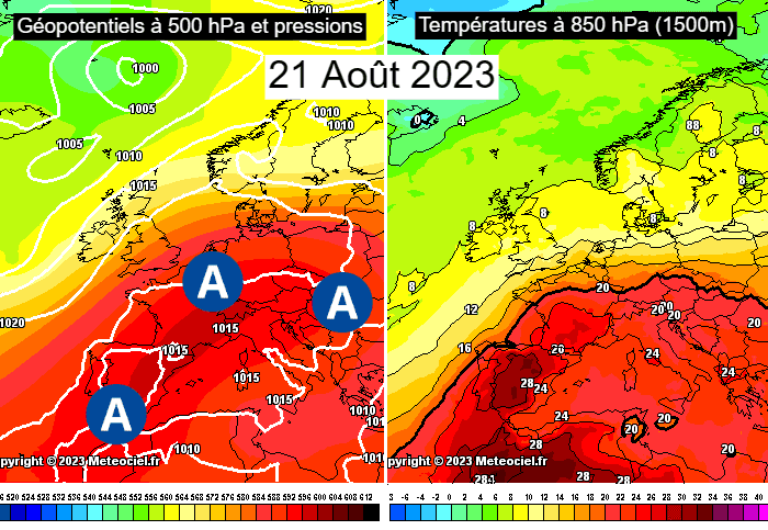 Le dôme de chaleur qui s'apprête à se former en cette seconde quinzaine d'août 2023 sera moins étendu. Contrairement à août 2003, les hautes pressions ne vont pas s'étendre jusqu'en Scandinavie, ce qui ne permettra pas à l'air le plus chaud d'atteindre les régions les plus septentrionales de la France. Entre la Bretagne et la Belgique, on ne parlera que d'un coup de chaud classique. Cependant, on note que les températures de la masse d'air vont atteindre des niveaux similaires à ceux observés en 2003 dans le sud de l'hexagone, ce qui est d'autant plus impressionnant que cette canicule intervient plus tard dans l'été que celle d'il y a 20 ans.