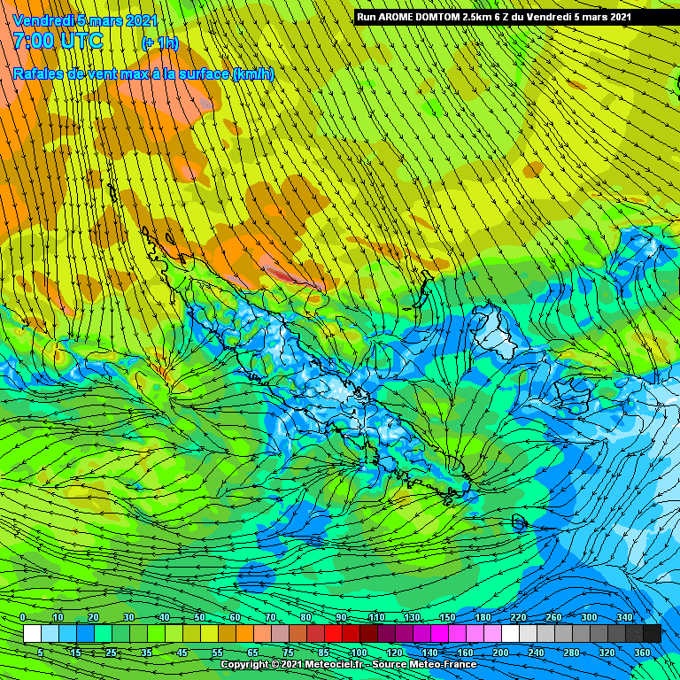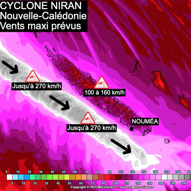 Des rafales de 180 à 200km/h sont envisagées sur le littoral, notamment demain après-midi, plutôt 100 à 160km/h sur le reste de la zone. Il n'est d'ailleurs pas complètement exclu que l'oeil de NIRAN, avec les vents les plus destructeurs, touche la Grande Terre.