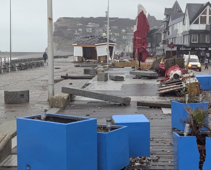 Dégâts parfois importants en Seine-Maritime la nuit dernière suite au passage de la tempête Goretti  - ici, le front de mer à Fécamp en Seine-Maritime après la grosse houle subversive de la tempête Goretti. La station du sémaphore a mesuré 157 km/h !  (© Le Phare à Images)