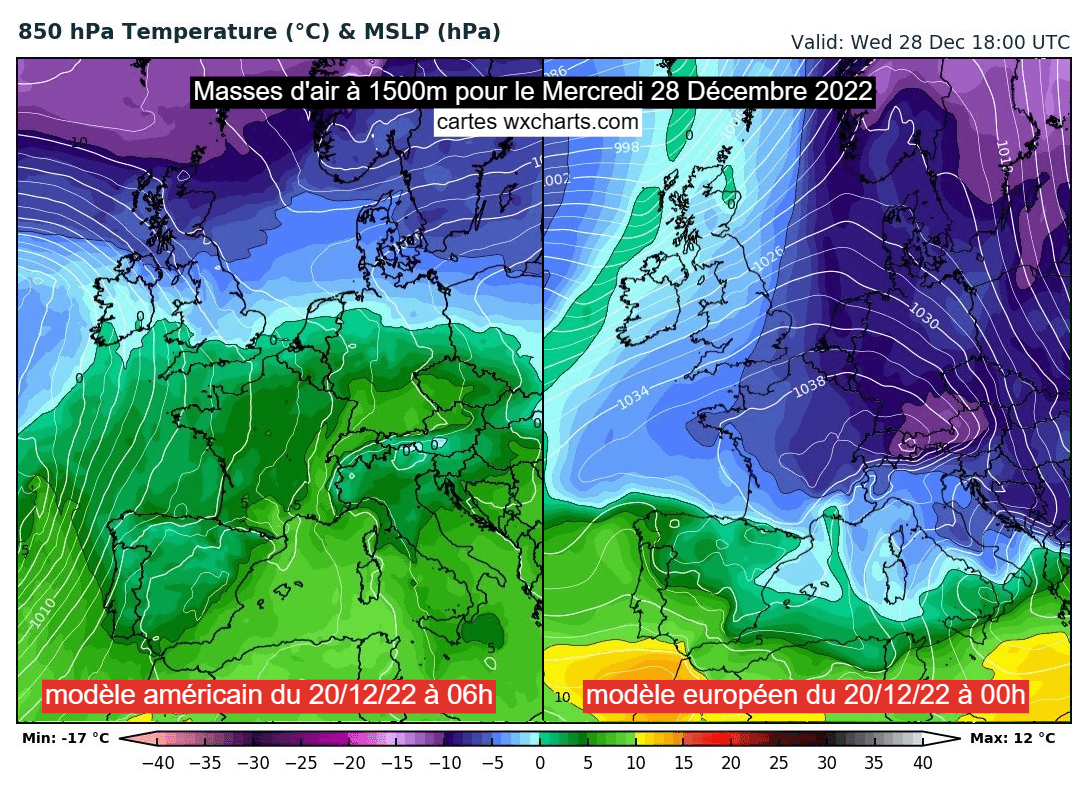 Masses d'air à 850 hPa (vers 1500m) le 28 décembre 2022 selon les modèles américain & européen - via wxcharts.com