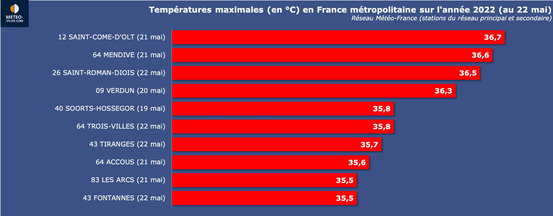 Avec 36.7°C, la station Aveyronnaise de Saint-Come-d'Olt détient la palme de la température la plus élevée de cette vague de chaleur (et par la même occasion la température provisoire la plus élevée en France en 2022). Cette valeur ne se situe qu'à 1°C seulement du record national fiable de chaleur pour un mois de mai en France (37.7°C dans les Landes, à Roquefort, le 30/05/2001).