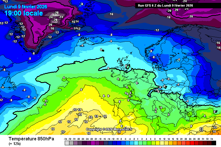 Animation des températures à 850 hPa sur l’Europe du 9 au 16 février 2026 – Modèle GFS via meteociel