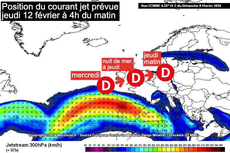 Position du courant jet prévue jeudi 12 février à 4h du matin - source fond de carte : Meteociel, retravaillée par Meteo-villes