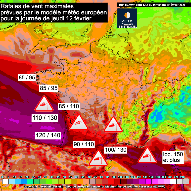 Le littoral aquitain et une grande partie de l’Occitanie, notamment les plaines du Roussillon et le relief du sud du Massif central, seraient particulièrement exposés à de violentes rafales, pouvant localement dépasser les 150 km/h. Le sud des Alpes et la Corse seront également très concernés.