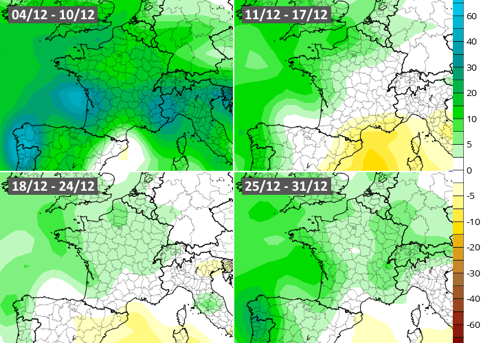 Après un premier week-end de décembre froid & calme, le flux océanique dépressionnaire devrait faire son retour dès la semaine du lundi 4 au dimanche 10 décembre 2023, qui s'annonce marquée par une succession de perturbations sur une grande partie de la France, donnant un arrosage copieux. Cette instabilité se poursuivrait en semaine du 11 au 17 décembre avec de nouveaux fronts pluvieux, possiblement plus discrets en Méditerranée. Le modèle européen est plus neutre pour la semaine du 18 au 24 décembre avant de redevenir humide lors de la semaine de Noël à Nouvel An.