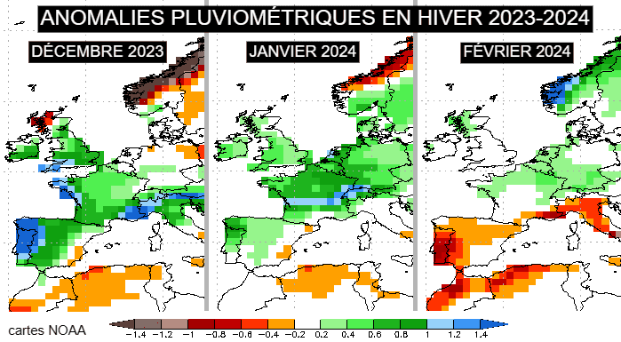 Anomalies pluviométriques mensuelles lors de l'hiver 2023-2024 - modèle américain via NOAA